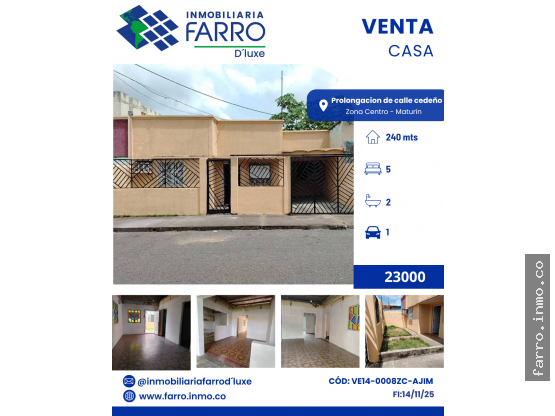 **Farro.inmo.co Vende* : Casa para remodelar ubicada en sector centro prolongación de calle Cedeño sector centro Maturín - Monagas, consta de : 5 habitaciones, 2 baños Baños,Cocina en mampostería, sala comedor, lavadero y estacionamiento para (1) vehículo. El inmueble está apropiado para remodelar queda a pie de calle ..