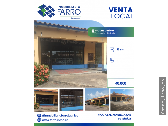 FARRO.INMO.CO vende local comercial de 35 m² estratégicamente ubicado en el Centro Comercial Las Colinas, justo en la vía principal de Tipuro, una de las zonas de mayor crecimiento y movimiento comercial de la ciudad.