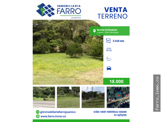 Dólares Americanos¡Oportunidad única de inversión en Caripe CON EXCLUSIVIDAD! FARRO.INMO.CO vende terreno de 3.440 m² ubicado en el sector El Guamo La Placeta, Municipio Caripe, Estado Monagas. Situado estratégicamente sobre la vía nacional a Caripe, a solo 2.5 km del pueblo y 1.2 km antes del cruce hacia la famosa Cueva del Guácharo, este terreno combina ubicación privilegiada con gran potencial. Ideal para: - Desarrollo habitacional - Proyecto turístico o ecológico - Actividades agrícolas o productivas Beneficios: - Acceso directo desde vía principal - Zona tranquila y de alto valor natural - Servicios básicos disponibles: electricidad, agua y sistema de cloacas - Documentación lista para negociar Invierte en una zona con encanto natural, historia y proyección. Este terreno es perfecto para quienes buscan tranquilidad, productividad o desarrollar un proyecto con visión. ¿Te interesa? ¡Contáctanos y hazlo tuyo!